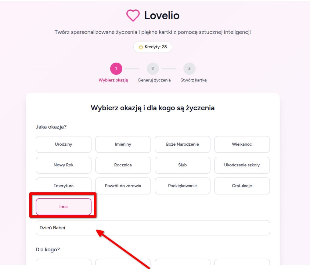 2. Wybrać okazję Inne, wpisać Dzień Babci i Dziadka